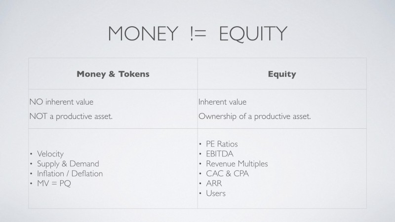 Tokens behave like money, and money does NOT behave like equity.